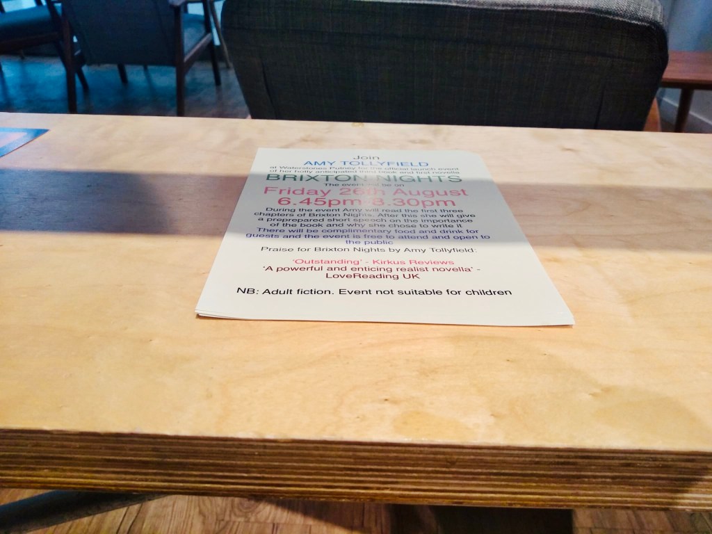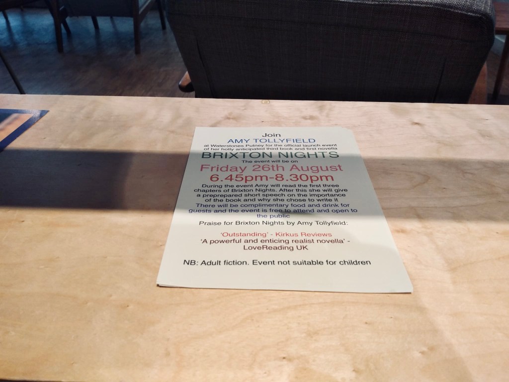 The official book launch event for Amy Tollyfield’s third published book and first novella, Brixton Nights, took place at Waterstones Putney in Putney, London on Friday 26th August 2022
